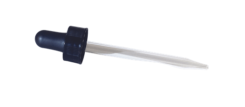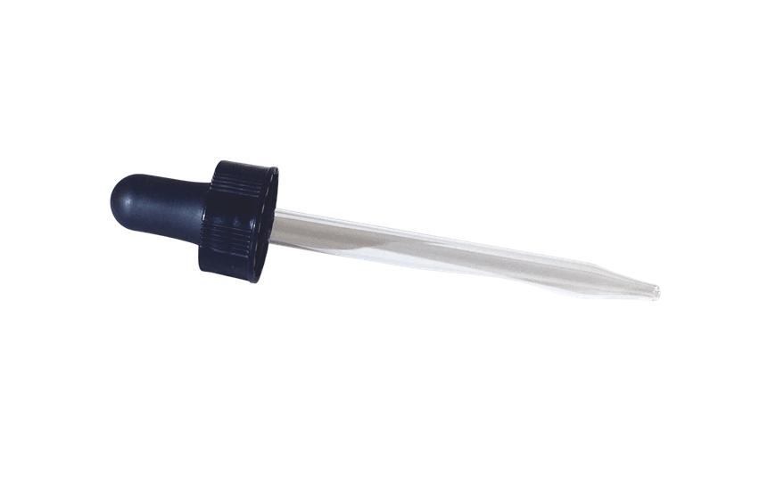 Kaufman Container supplies a variety of glass droppers, including this 20-400 Black Glass Dropper. This dropper has a polypropylene (PP) plastic dropper and a 89 mm type 3 glass pipette. The glass pipette and .8 cc rubber bulb can be used for several product lines including essential oils, medicine and skincare products.