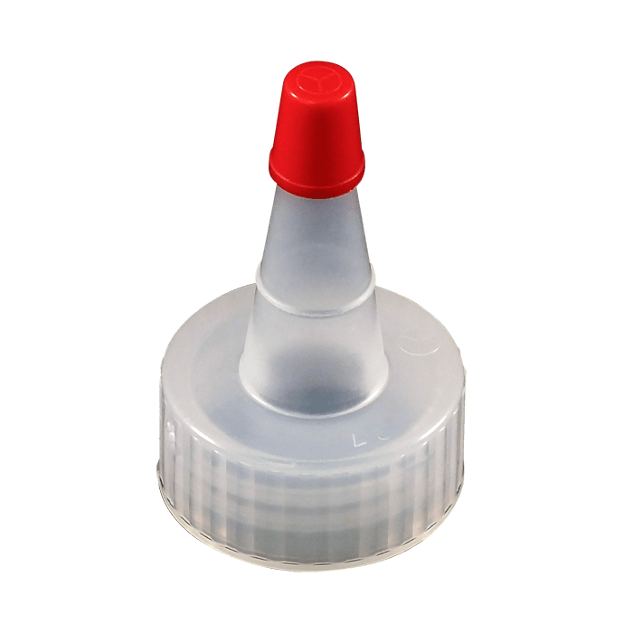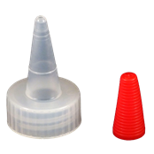 Kaufman Container provides a variety of plastic dispensing caps including yorker caps, disc top caps and spout caps. This 24-400 Natural LDPE Plastic Yorker cap has a .030 orifice and the regular red sealer tip is attached. We also stock the same cap with no hole and the long red sealer tip (#1002007). Yorker spout caps are great for dispensing products such as condiments and used frequently in the crafting industry.