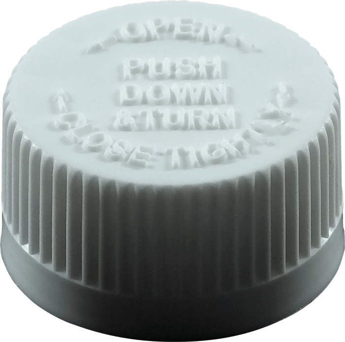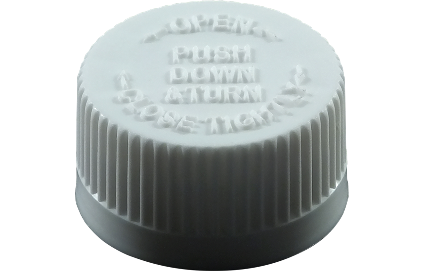 Kaufman Container provides a variety of caps and closures including child resistant caps. We offer various colors, neck finishes and styles such as pictorial and text options. This 24-400 PP White child resistant cap has a PE foam liner and is printed with the text "Open - Push Down & Turn - Close Tightly". These child proof caps are commonly used in the pharmaceutical industry, but can be used for any product that needs to be child resistant.