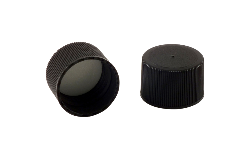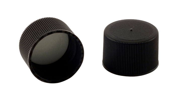 Kaufman Container stocks a variety of plastic caps and closures including screw caps, dispensing caps and child resistant caps. This 24-410 Black PP Plastic screw cap has a ribbed skirt and a PE foam liner. Due to the polypropylene plastic material, this cap has a high heat resistance and good chemical resistance. Plastic screw caps are also referred to as continuous thread caps or CT caps.