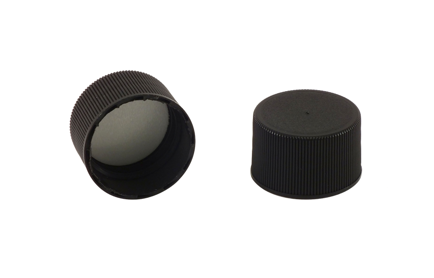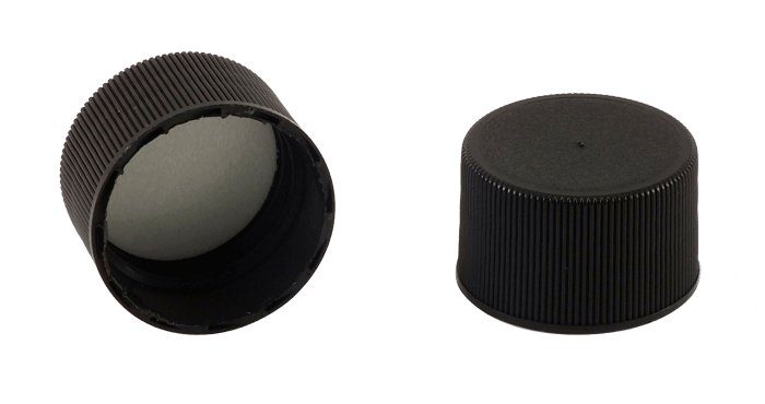 Kaufman Container stocks a variety of plastic caps and closures including screw caps, dispensing caps and child resistant caps. This 28-410 Black PP Plastic screw cap has a ribbed skirt and a PE foam liner. Due to the polypropylene plastic material, this cap has a high heat resistance and good chemical resistance. Plastic screw caps are also referred to as continuous thread caps or CT caps.