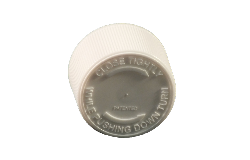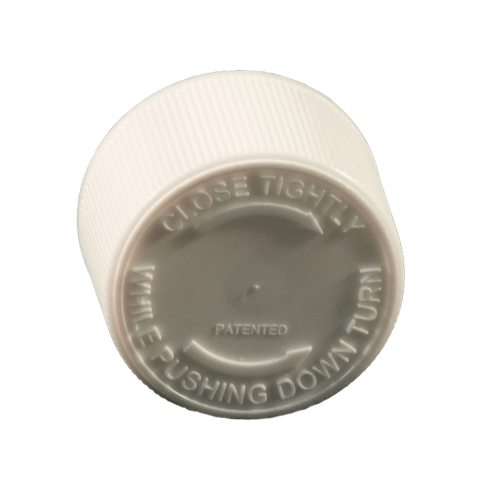 Kaufman Container provides a variety of caps and closures including child resistant caps. We offer various colors, neck finishes and styles such as pictorial and text options. This 28-410 PP White child resistant cap has a PE foam liner and is printed with the text "Close Tightly - While Pushing Down Turn". These child proof caps are commonly used in the pharmaceutical industry, but can be used for any product that needs to be child resistant.
