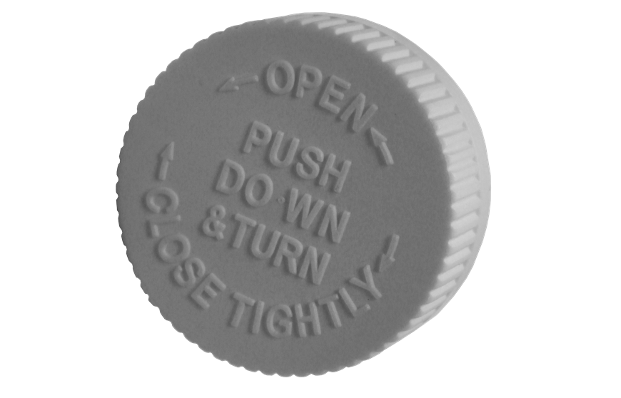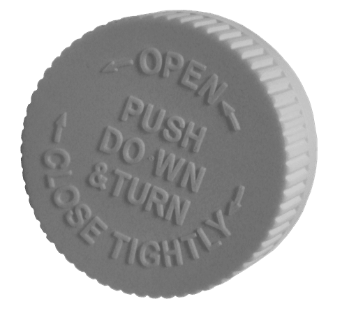 Kaufman Container provides a variety of caps and closures including child resistant caps. We offer various colors, neck finishes and styles such as pictorial and text options. This 38-400 PP White Push Down & Turn child resistant cap has a .020 Prt (075) Induction Liner for HD. These child proof caps are commonly used in the pharmaceutical industry, but can be used for any product that needs to be child resistant.