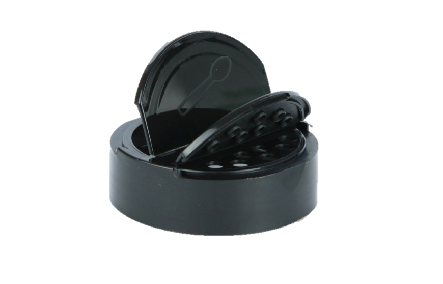 Kaufman Container supplies a variety of spice caps, flapper caps, spice grinders and other caps for spices. This flip top Black spice cap has a 63-485 neck finish and multiple liners are available. In addition to the 63-485 cap, we also provide the 43-485 and 53-485 style in Red or Black. This easy to use spice cap can be paired with one of our wholesale glass spice jars or a plastic spice jar. MOQ: 25,000