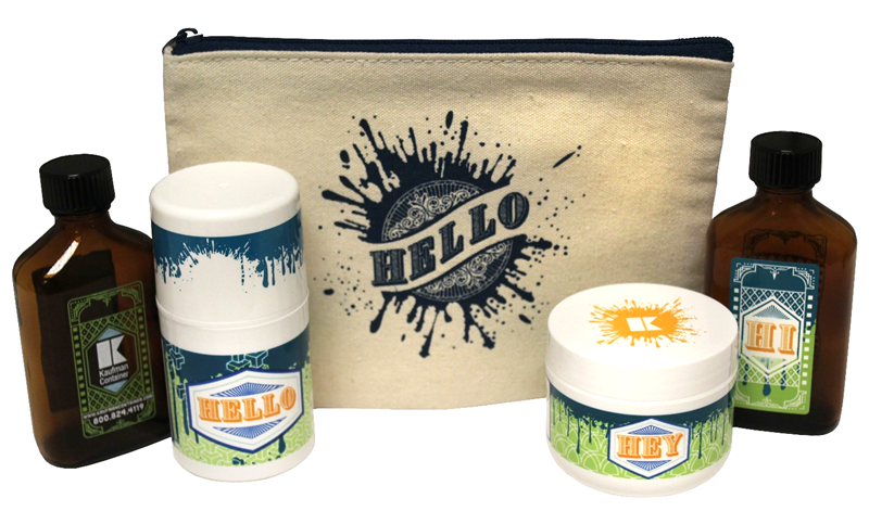 Kaufman Container's sample decorating kit is comprised of a glass bottle, plastic bottle, plastic jar and a cloth zip up travel bag. All of these items were sourced and decorated by Kaufman Container, which truly showcases our capabilities as one of the top packaging and labeling companies. Below is a more detailed breakdown of the style of container and explains what type of printing or labeling was applied.
