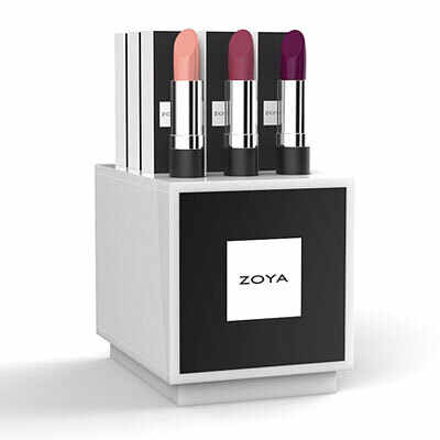 Art of Beauty wanted to launch their Zoya lipsticks in style, while making it convenient for their salons and retailers to display. Kaufman Container worked closely with them to turn a paper modeled concept into an actual cardboard display to present their new lipstick line. The lipstick bases are supplied and screen printed with the Zoya logo and once filled are packaged into individual cartons. The beautifully designed cardboard displays are extremely functional and unique. They were designed to house all the components making the actual display a “self shipper”. The magnetic folding door on the display allows for easy access to the components that are nicely nested into the back of the display. The first row was die-cut round to hold the lipsticks that are to be used as the “testers”. The remaining square slots were designed to hold the individually boxed lipsticks that are presented for sale. The pedestal base completes the overall design. Kaufman provided three different display sizes. A three color set that holds nine sellable lipsticks, a six color set that holds 18 lipsticks and the master set holding 12 color “testers” and a total of 72 sellable lipsticks. This is a true example of a packaging line that went from “concept to completion” fairly quickly and allowed the Zoya name to extend from nail color into the lip color market.